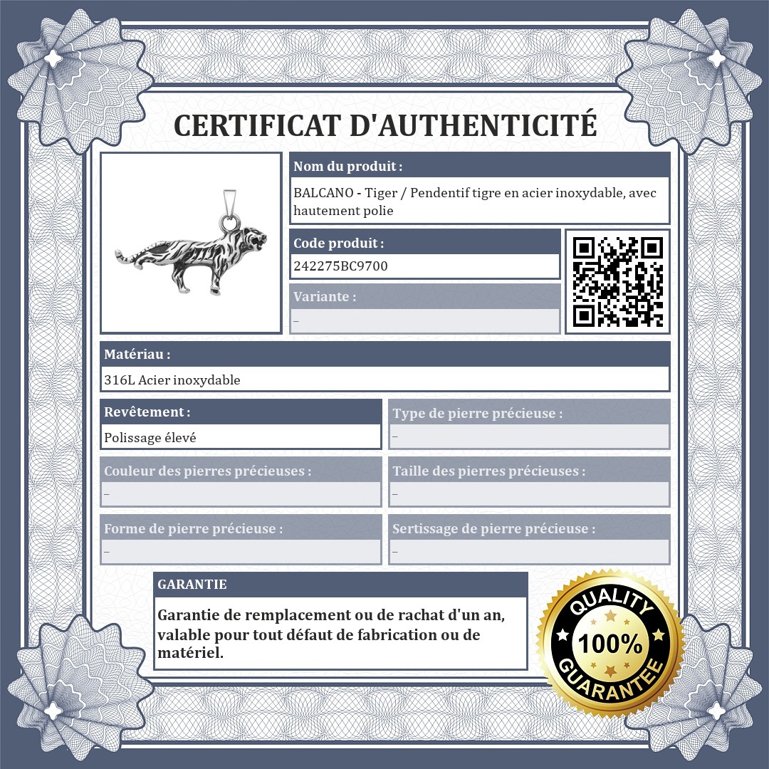BALCANO - Tiger / Pendentif tigre en acier inoxydable, avec hautement polie