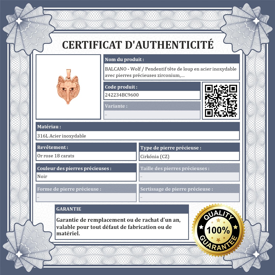Pendentif en forme de tête de loup en acier inoxydable médical 316L, plaqué or rose 18K. Le matériau est hypoallergénique, non abrasif et non corrosif. Les yeux du loup sont faits de pierres précieuses en zirconium noir.