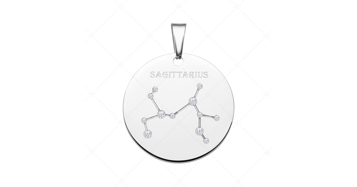 Pendentif horoscope du Sagittaire. Accessoire en acier inoxydable médical 316L, avec hautement polie. La constellation se trouve dans un motif gravé, décoré de pierres de zirconium étincelantes comme de minuscules petites étoiles brillantes.