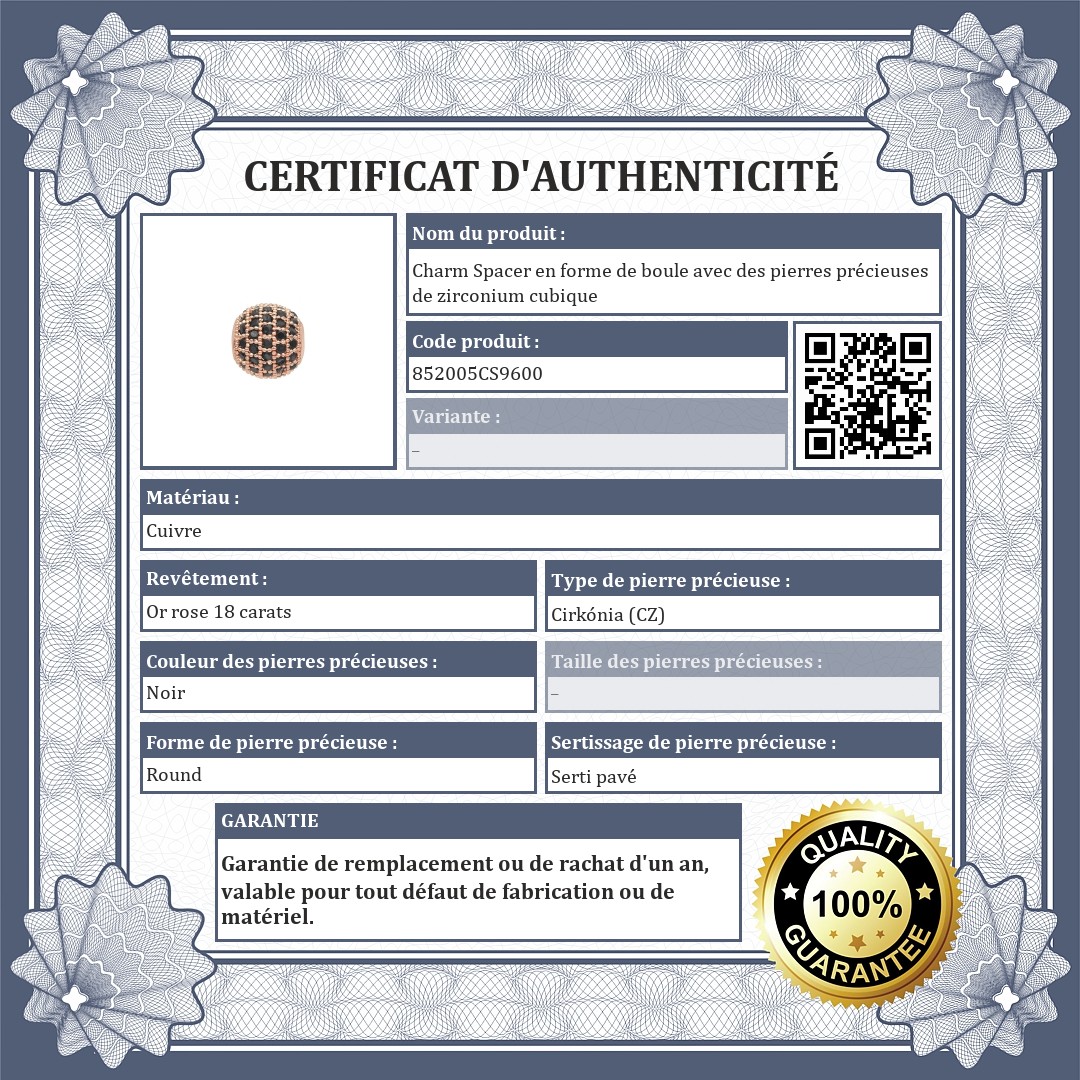 Charm spacer en forme de boule. Ornée en cercle, en plusieurs rangées, de cristaux de zirconium cubique noirs étincellent. Fabriqué en cuivre plaqué or rose 18K. Les spacers permettent à vos charms et perles de ne pas glisser sur le bracelet.