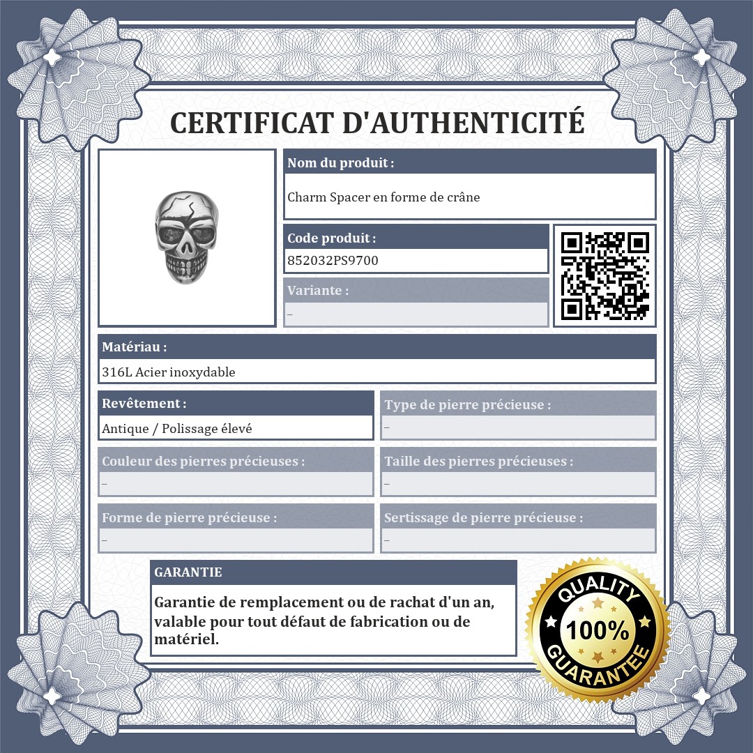 Charm Spacer en forme de crâne. Accessoire en acier inoxydable de qualité médicale 316L, avec une finition spéciale antiquaire. Les spacers permettent d'éviter que les charms et les perles ne glissent de votre bracelet.
