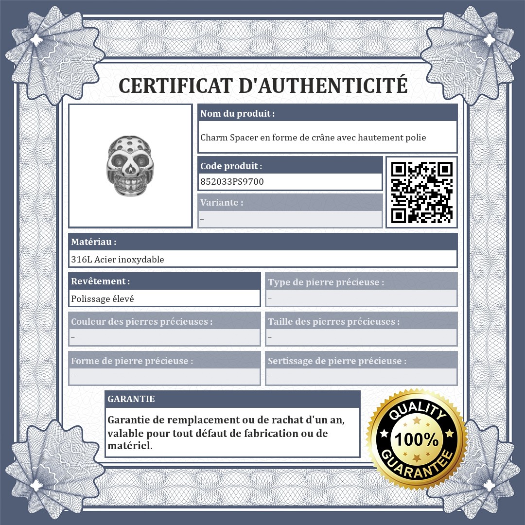 Charm Spacer en forme de crâne avec des indentations sur la surface. Accessoire en acier inoxydable de qualité médicale 316L, avec hautement polie. Les spacers permettent d'éviter que les charms et les perles ne glissent de votre bracelet.