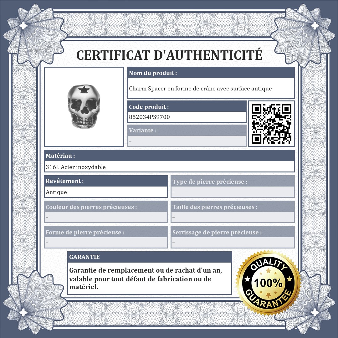 Charm Spacer en forme de crâne, décoré avec une étoile au sommet. Accessoire en acier inoxydable de qualité médicale 316L, avec une finition spéciale antiquaire. Les spacers permettent d'éviter que les charms et les perles ne glissent de votre bracelet.