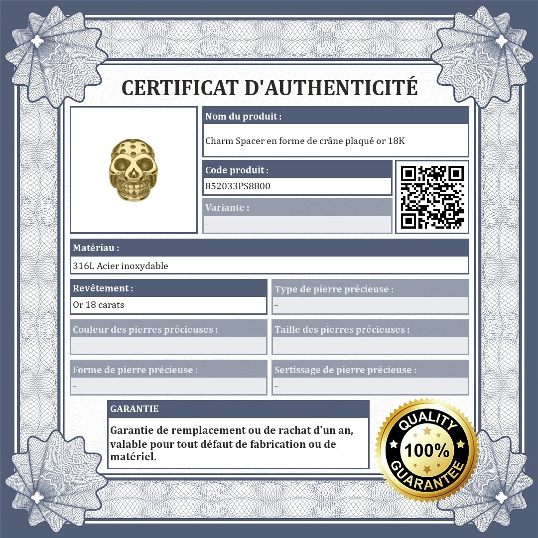 Charm Spacer en forme de crâne avec des indentations sur la surface. Accessoire en acier inoxydable de qualité médicale 316L, plaqué or 18K. Les spacers permettent d'éviter que les charms et les perles ne glissent de votre bracelet.