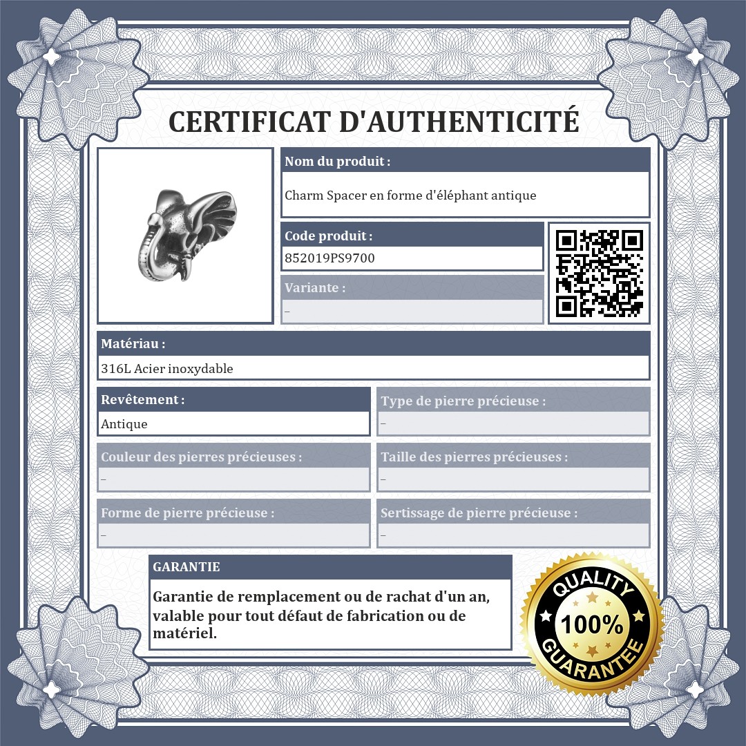 Charm spacer en forme d'élephant antique. Fabriqué en acier inoxydable de qualité médicale 316L avec une finition spéciale antiquaire. De haute qualité, il ne s'usera pas et ne ternira pas à l'usage. Les spacers permettent d'éviter que les charms et les perles ne glissent de votre bracelet.