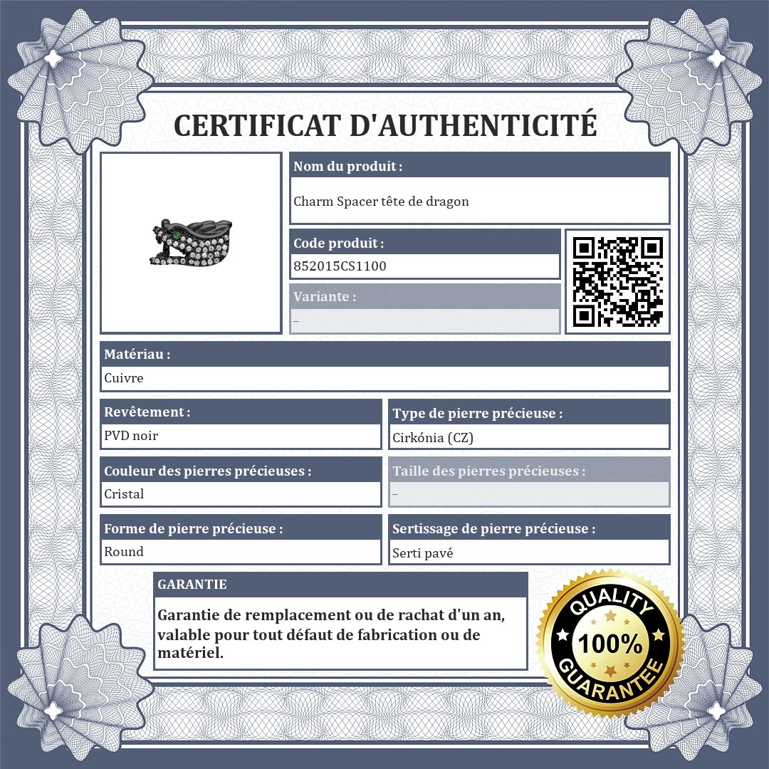 Charm spacer en forme de tête de dragon. Fabriqué en cuivre avec plaqué en PVD noir chromé. Sertie d'étincelantes pierres de zirconium cubique transparentes et vertes. Les spacers empêchent les charms et perles de glisser sur le bracelet.
