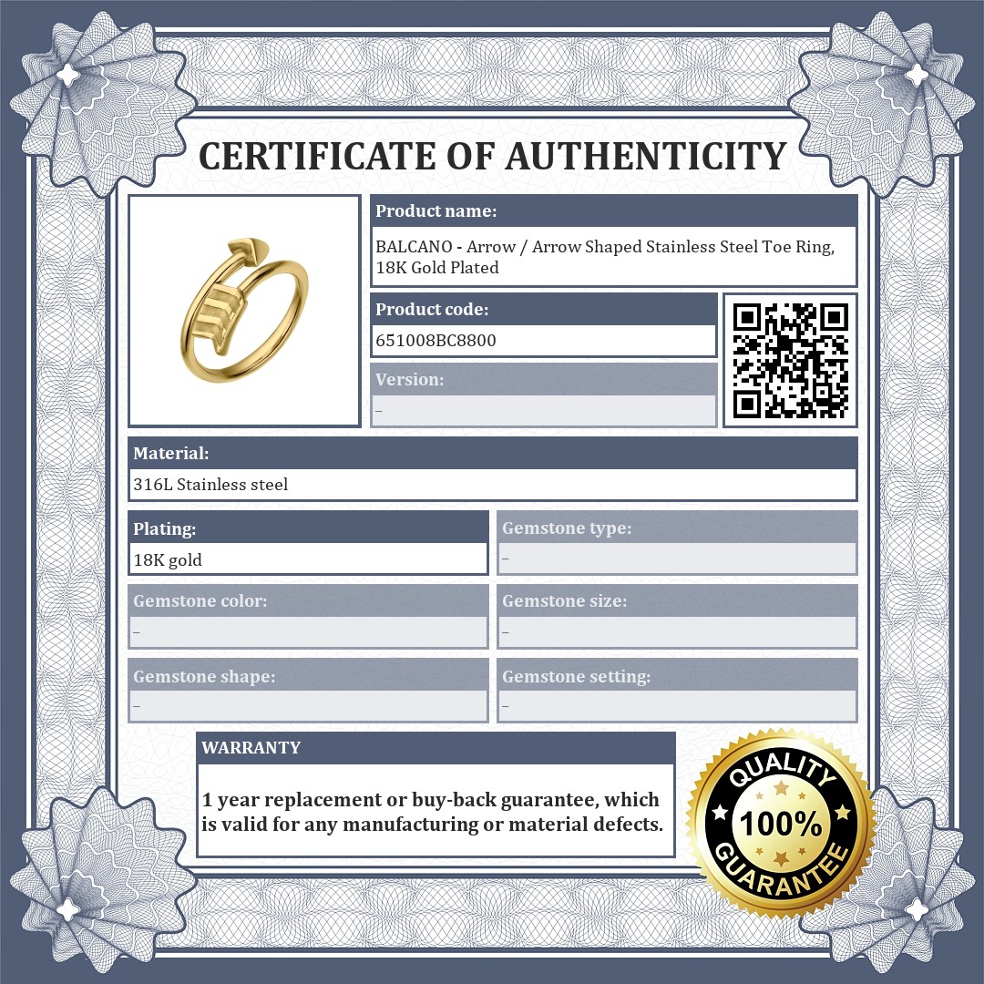 Antyallergenic 316L medical stainless steel jewelry, 18K gold plated. The toe ring represents an arrow.