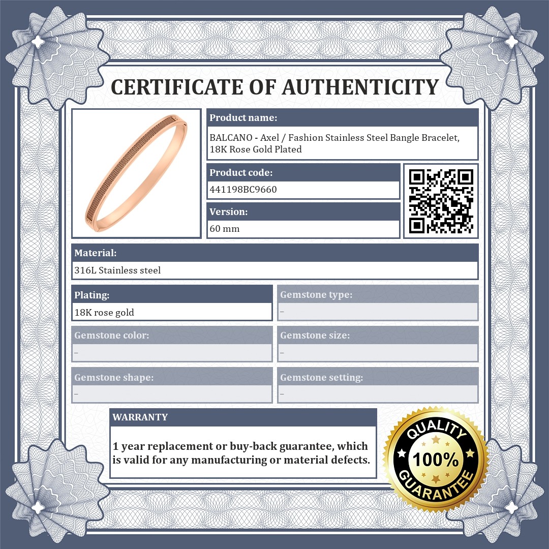 316L medical stainless steel bangle bracelet with 18K rose gold plated. Thanks to its quality material, it will not wear or tarnish with use. Unique, fashionable accessory, decorated with a special mesh insert.