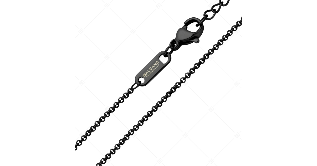 316L medical grade stainless steel belcher chain type necklace with secure lobster claw clasp. Black, chrome PVD plated.
