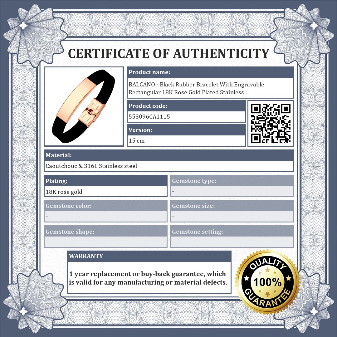 BALCANO - Black Rubber Bracelet With Engravable Rectangular 18K Rose Gold Plated Stainless Steel Headpiece (553096CA11)