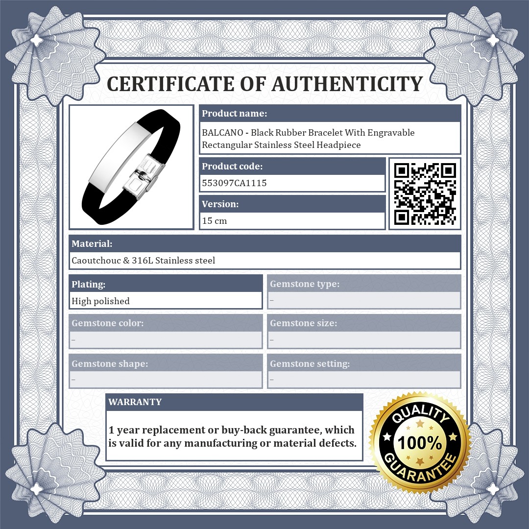 BALCANO - Black Rubber Bracelet With Engravable Rectangular Stainless Steel Headpiece