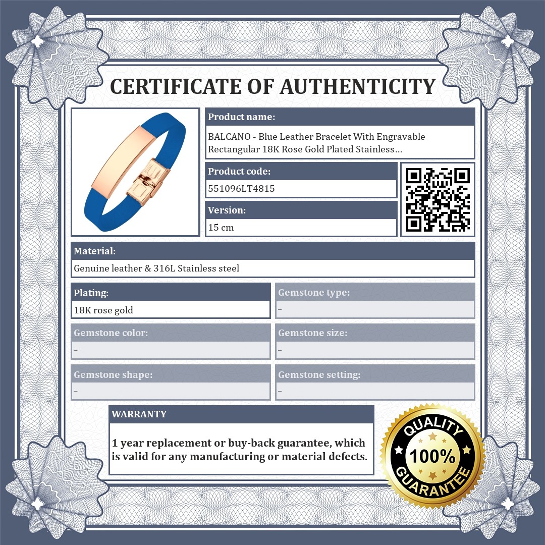 Blue genuine cowhide leather bracelet with a rectangular 18K rose gold plated 316L stainless steel headpiece. The surface is smooth, so it can be engraved to create a unique piece of jewelry.
