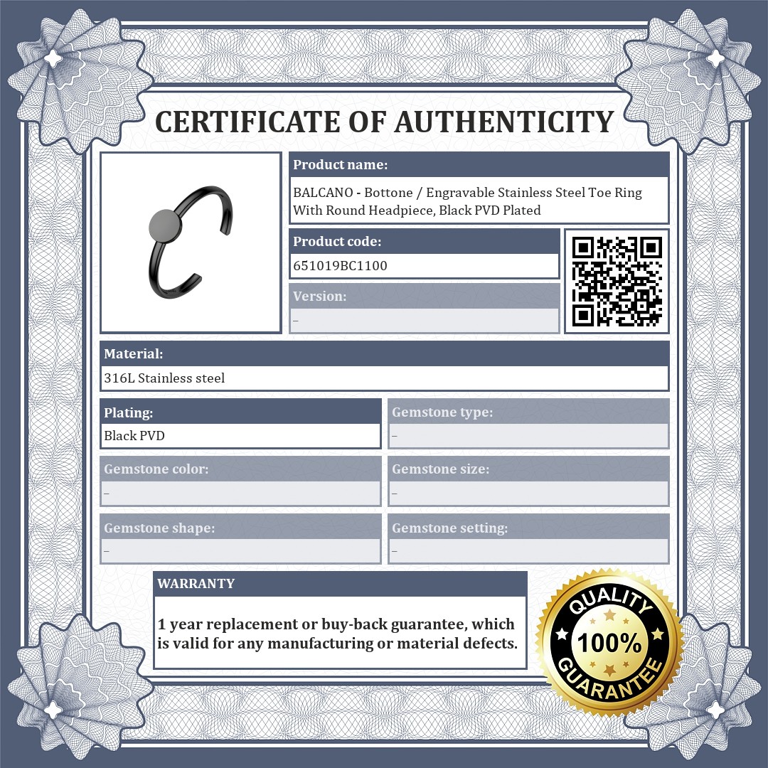 BALCANO - Bottone / Engravable Stainless Steel Toe Ring With Round Headpiece, Black PVD Plated