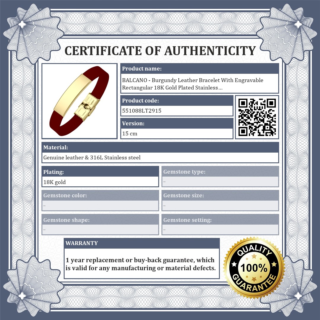 BALCANO - Burgundy Leather Bracelet With Engravable Rectangular 18K Gold Plated Stainless Steel Headpiece