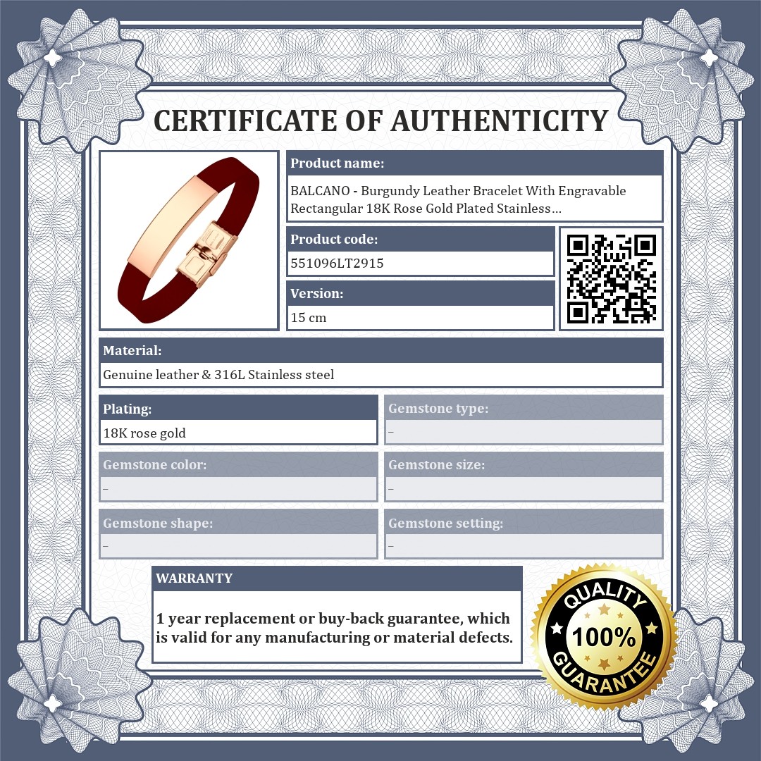 Burgundy genuine cowhide leather bracelet with a rectangular 18K rose gold plated 316L stainless steel headpiece. The surface is smooth, so it can be engraved to create a unique piece of jewelry.
