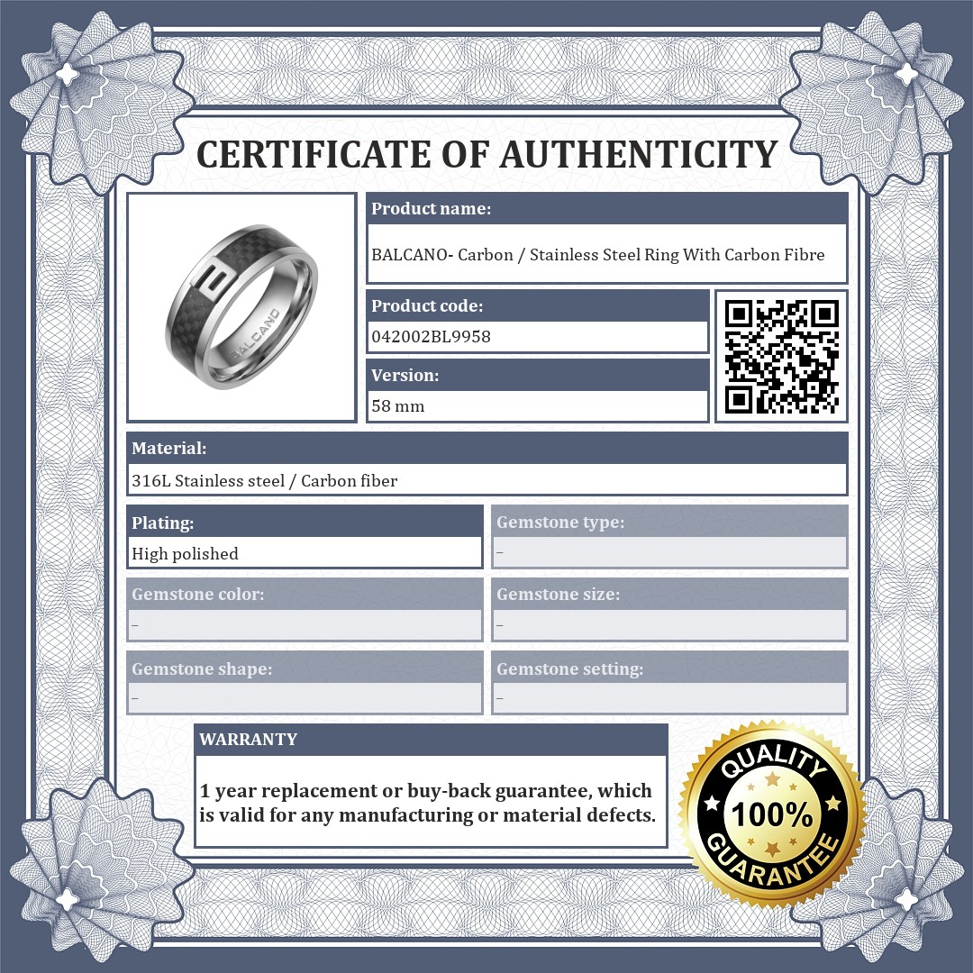 Anti- allergy, 316L stainless steel ring with high polish. The fashionable and unique jewelry is decorated with a black carbon fibre inlay in the centre, with the BALCANO logo on a brushed, matt surface.