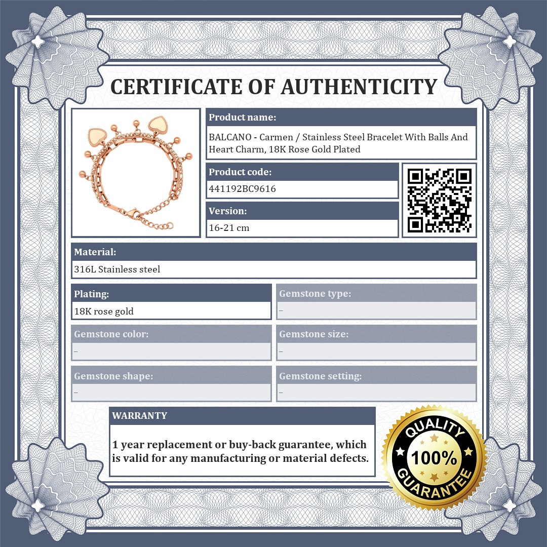 Fashionable bracelet for women, decorated with balls and heart shaped charms. 316L medical grade stainless steel, two chain accessories, 18K rose gold plated.