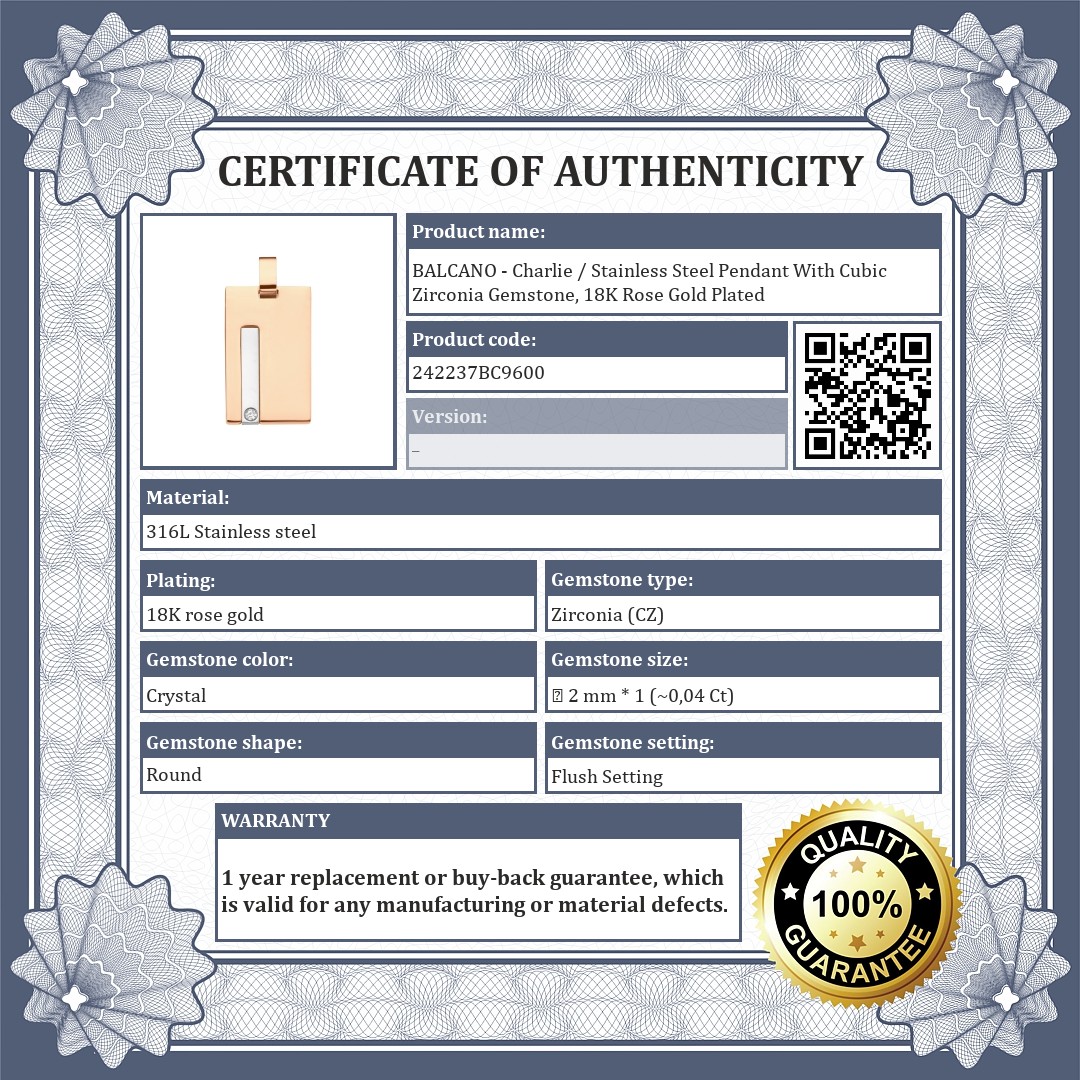 BALCANO - Charlie / Stainless Steel Pendant With Cubic Zirconia Gemstone, 18K Rose Gold Plated