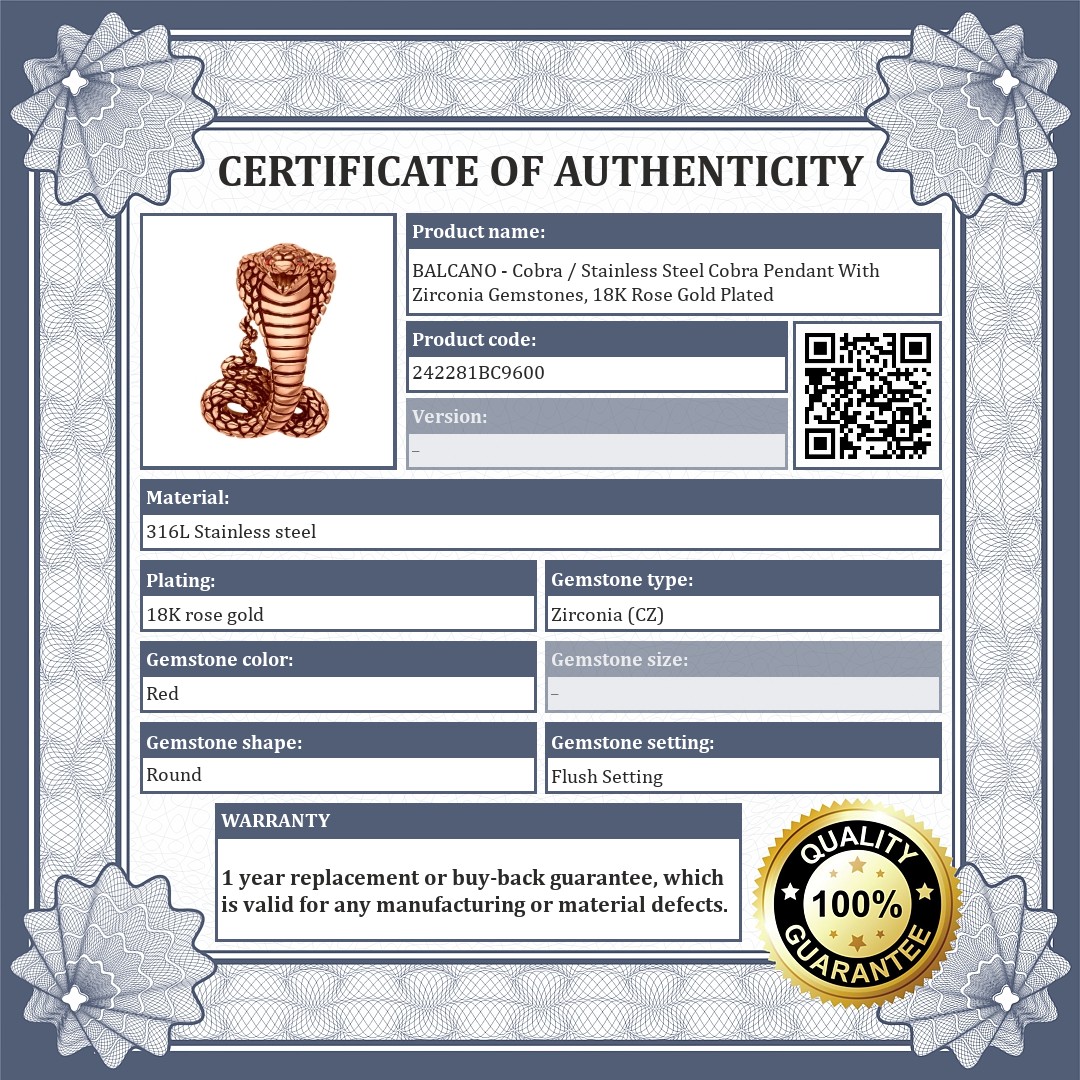 BALCANO - Cobra / Stainless Steel Cobra Pendant With Zirconia Gemstones, 18K Rose Gold Plated