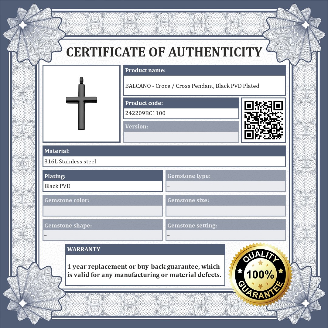 Anti-allergy, medical 316L stainless steel, slightly convex cross-shaped pendant with black, PVD plated. Thanks to its material, it will not wear or discolour during daily use.