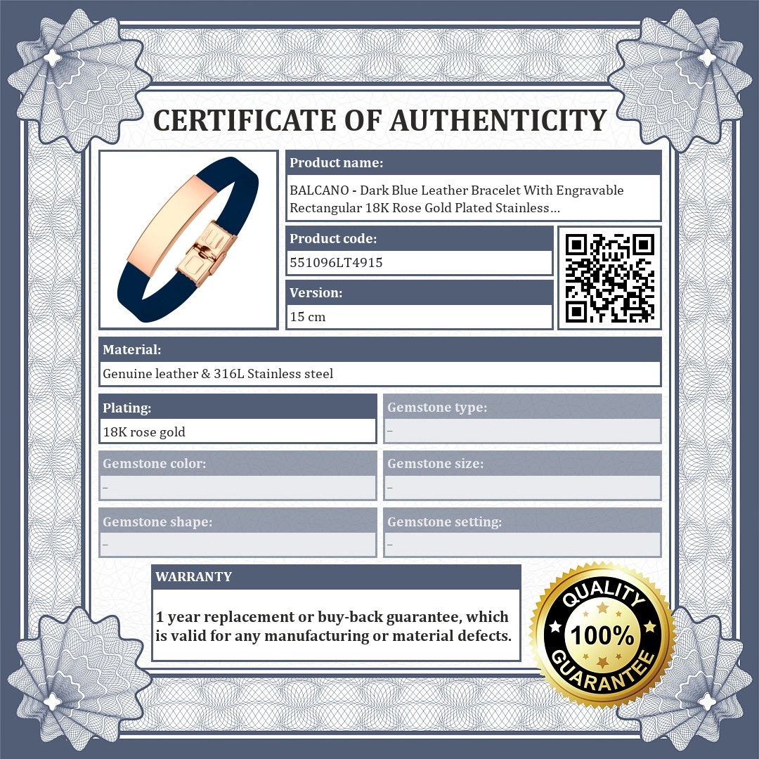 BALCANO - Dark Blue Leather Bracelet With Engravable Rectangular 18K Rose Gold Plated Stainless Steel Headpiece