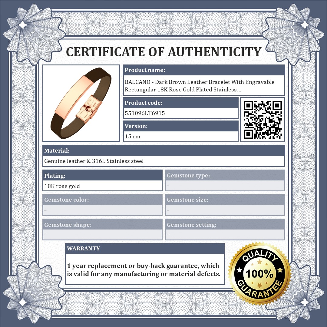 Dark brown genuine cowhide leather bracelet with a rectangular 18K rose gold plated 316L stainless steel headpiece. The surface is smooth, so it can be engraved to create a unique piece of jewelry.