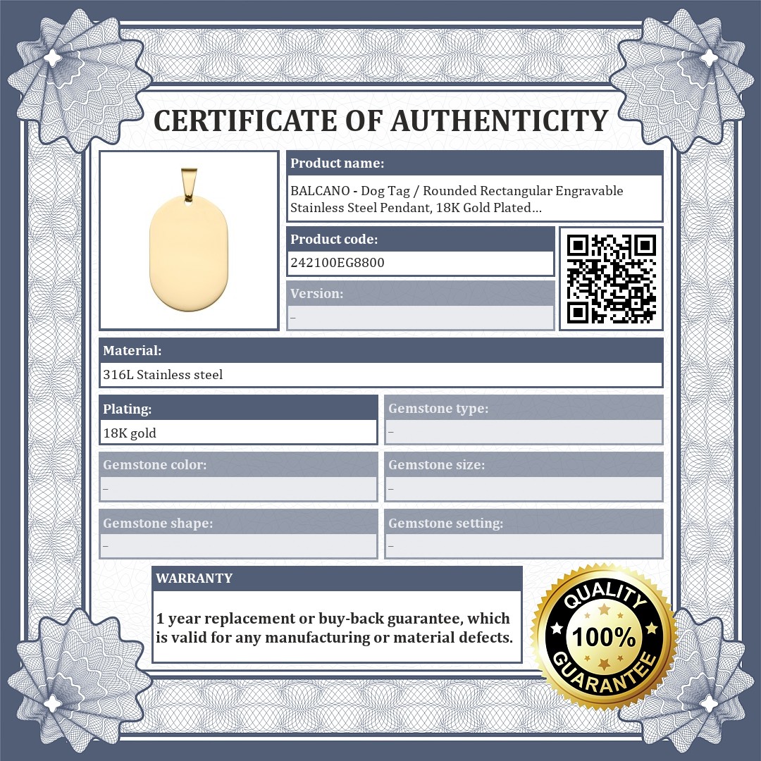 BALCANO - Dog Tag / Rounded Rectangular Engravable Stainless Steel Pendant, 18K Gold Plated
