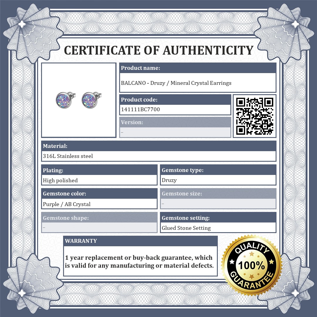 Anti-allergy, medical 316L stainless steel, round stud earrings with high-gloss polish and butterfly clasp. A headpiece set with special shimmering druzy crystals makes it truly unique. Druzy crystal is a natural form of minerals that occur naturally.