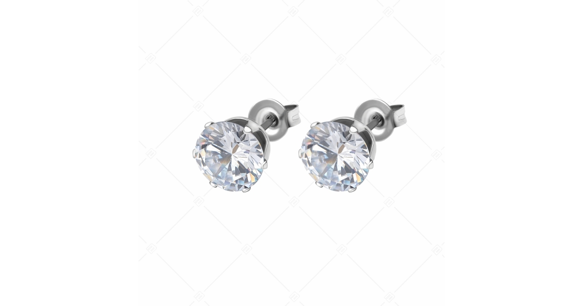 Clear, round cubic zirconia gemstone stud earrings in 6 mm and 8 mm sizes. 316L medical grade stainless steel jewelry, which does not wear or discolour due to its material.