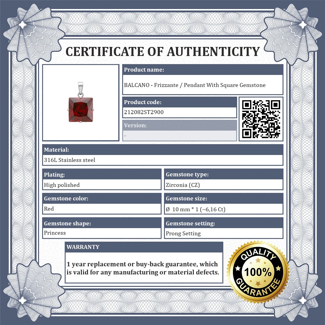 Granet-red, square cubic zirconia pendant. 316L medical grade stainless steel jewelry that will not tarnish or discolour.