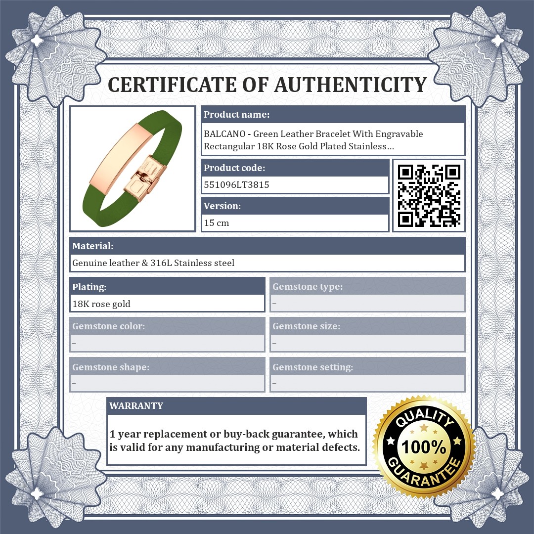 Green genuine cowhide leather bracelet with a rectangular 18K rose gold plated 316L stainless steel headpiece. The surface is smooth, so it can be engraved to create a unique piece of jewelry.