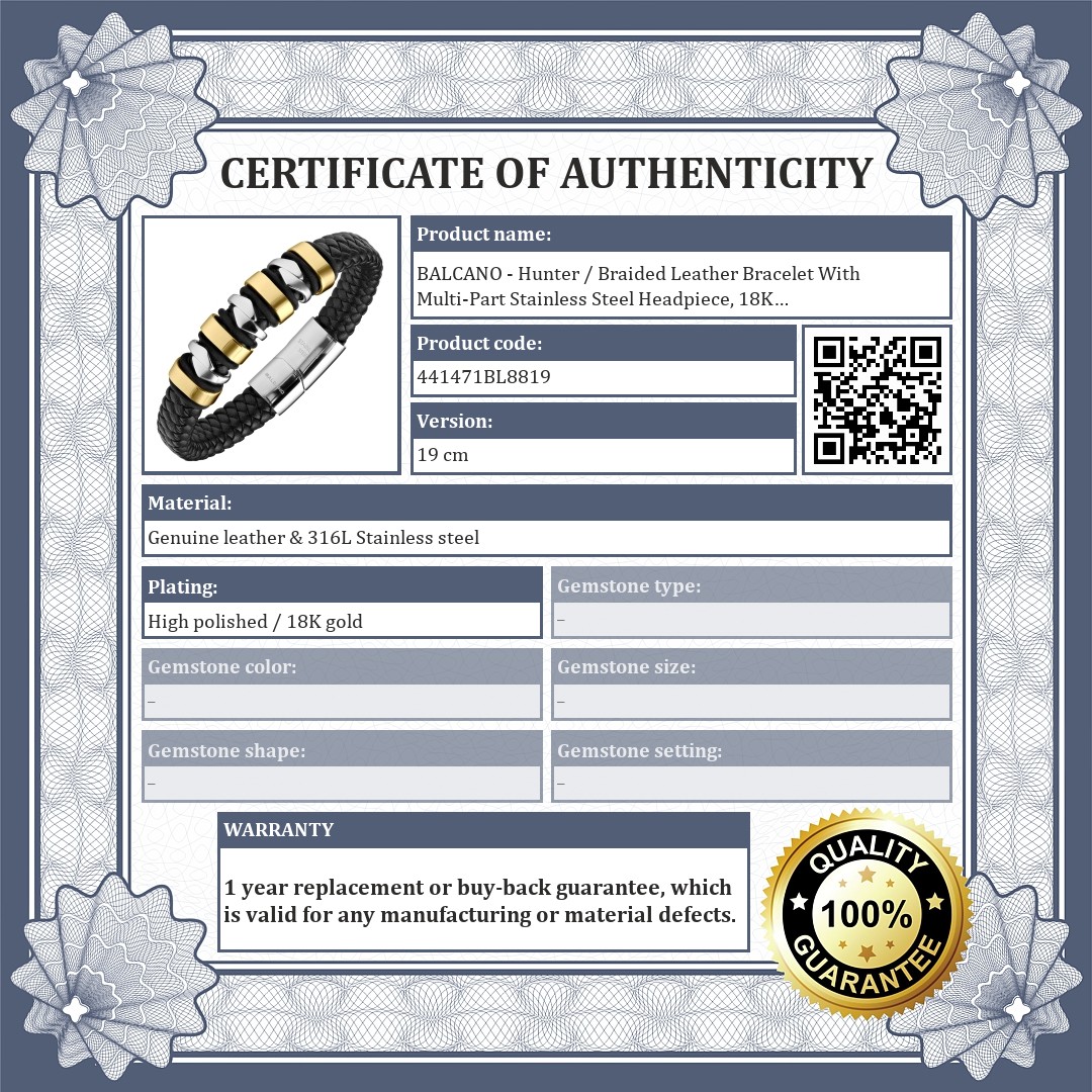 BALCANO - Hunter / Braided Leather Bracelet With Multi-Part Stainless Steel Headpiece, 18K Gold Plated