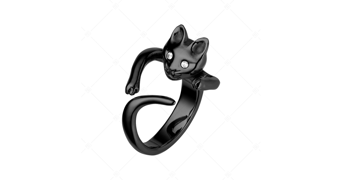 Cat shaped ring with two clear cubic zirconia gemstone eyes. When put on the finger, it looks like a kitten is hugging it. Anti-allergenic, 316L medical grade stainless steel jewelry, plated with black PVD.