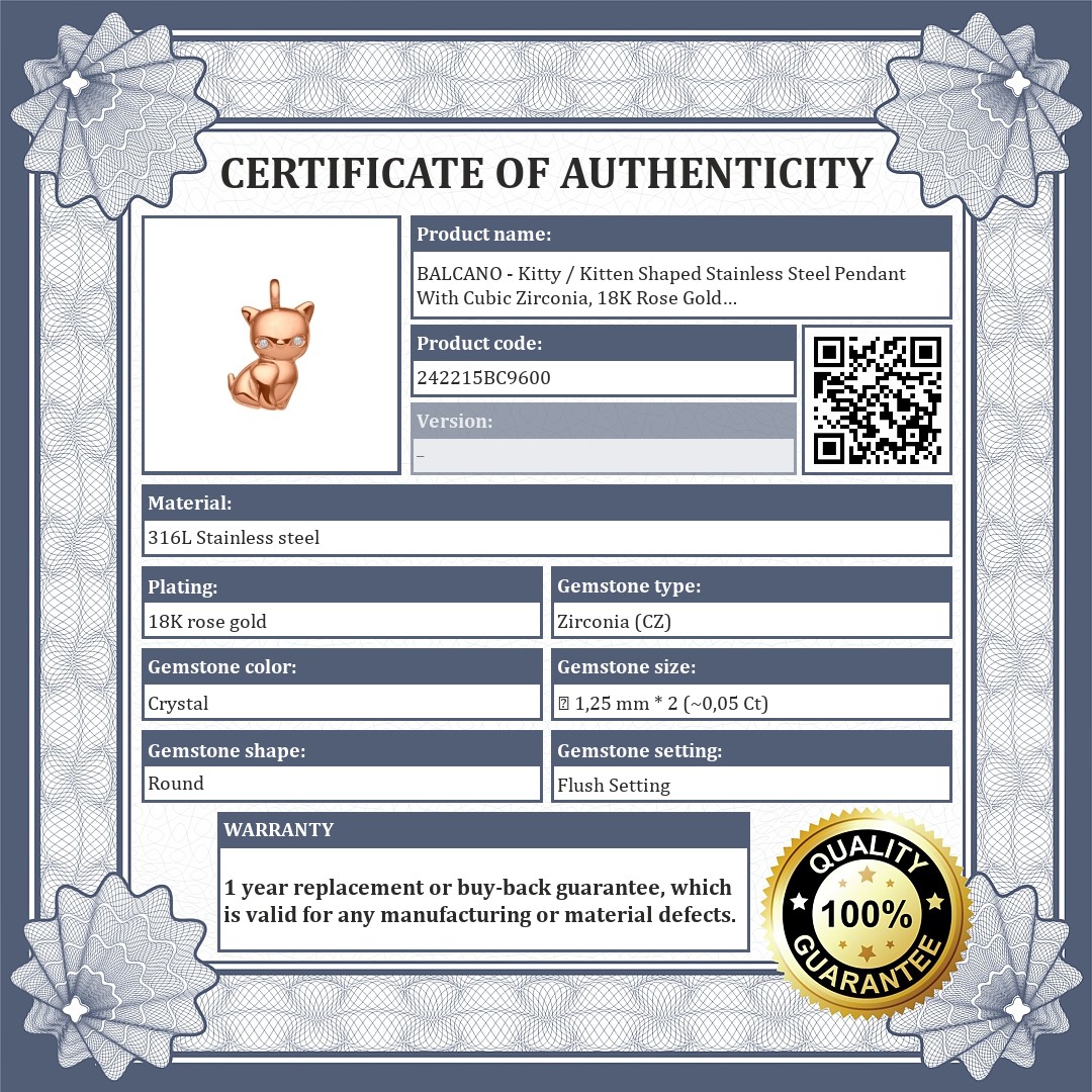BALCANO - Kitty / Kitten Shaped Stainless Steel Pendant With Cubic Zirconia, 18K Rose Gold Plated