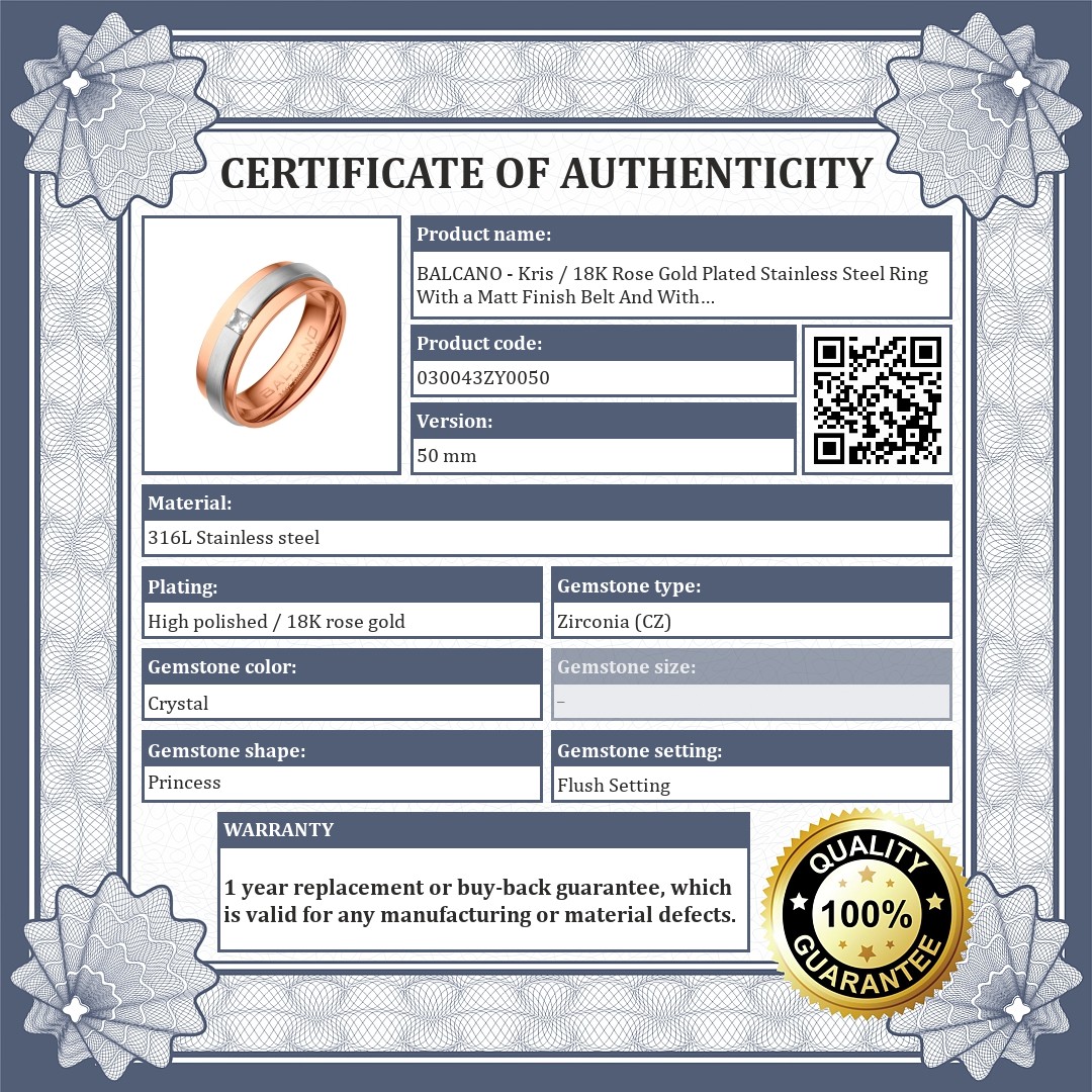 BALCANO - Kris / 18K Rose Gold Plated Stainless Steel Ring With a Matt Finish Belt And With Cubic Zirconia Gemstone