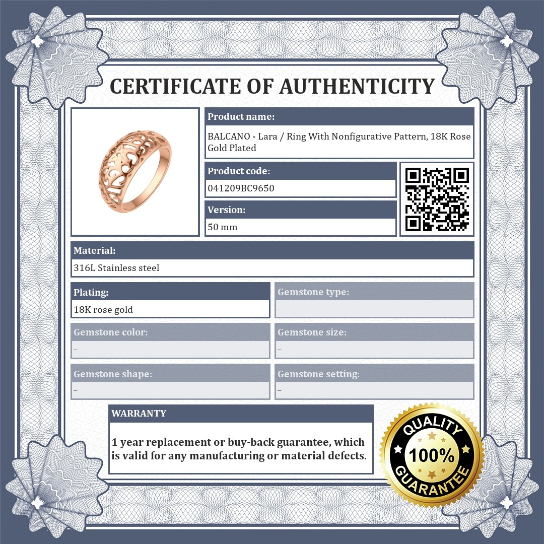 Anti-allergy, 316L stainless steel ring with beautiful 18K rose gold plated. The slightly curved headpiece is decorated with a non-figurative openwork pattern.