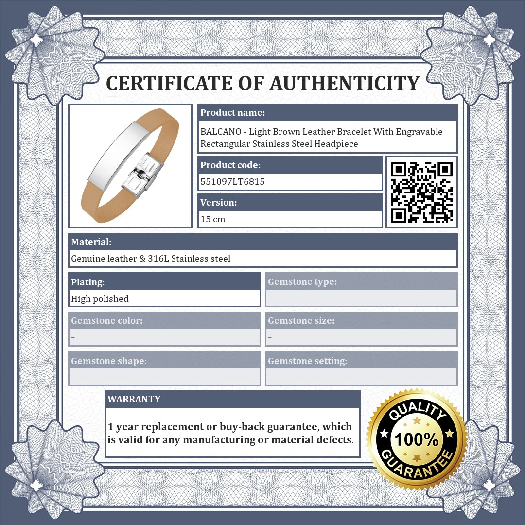 BALCANO - Light Brown Leather Bracelet With Engravable Rectangular Stainless Steel Headpiece