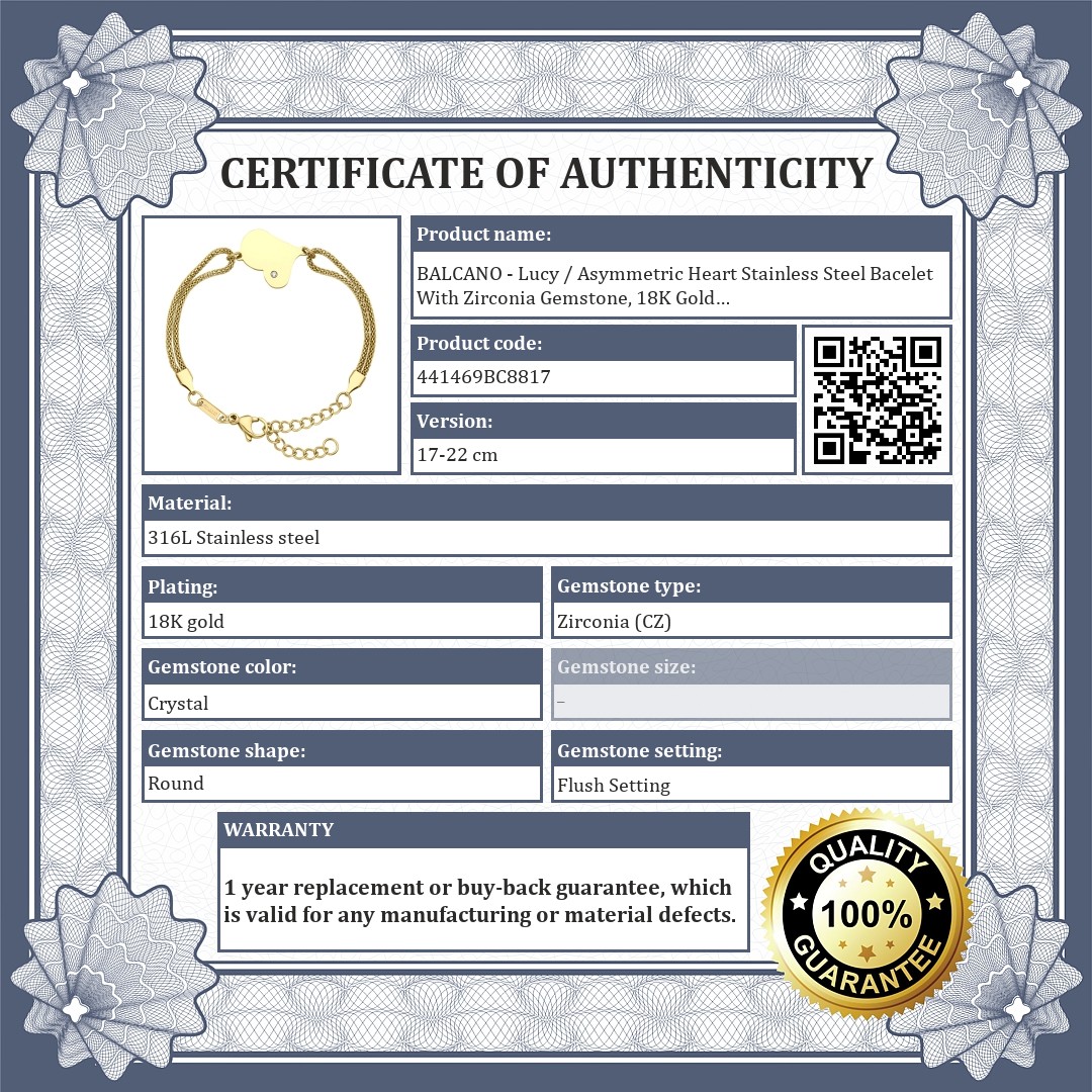 BALCANO - Lucy / Asymmetric Heart Stainless Steel Bacelet With Zirconia Gemstone, 18K Gold Plated