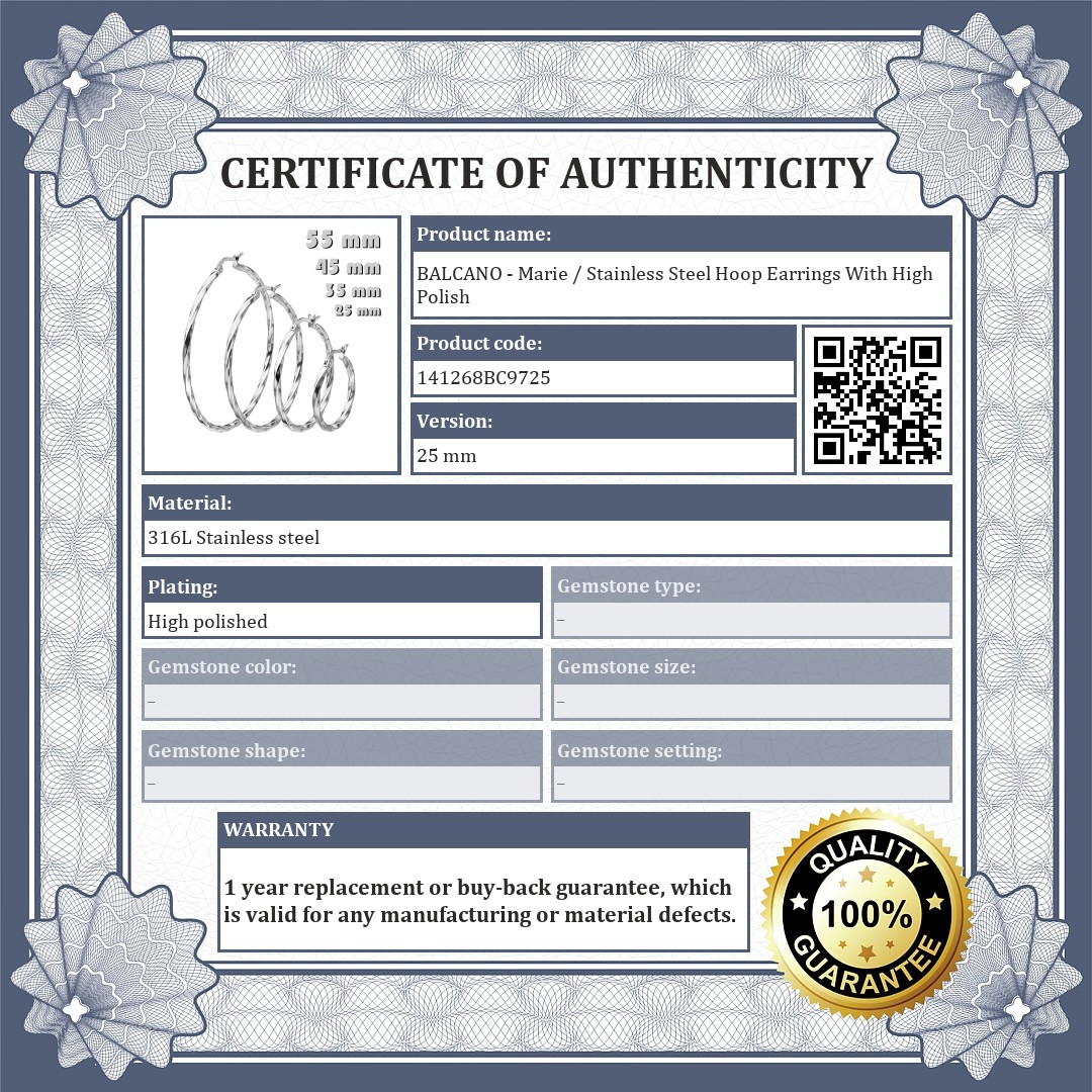 316L stainless steel twisted hoop earrings with high polish. Anti-allergy jewelry so anyone can wear it safely. Thanks to its material, it will not discolour or wear off, and is not sensitive to spas or cleaning products.