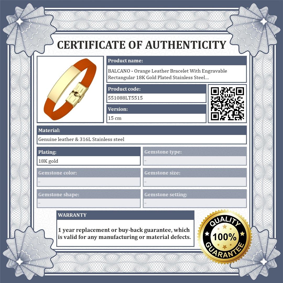 BALCANO - Orange Leather Bracelet With Engravable Rectangular 18K Gold Plated Stainless Steel Headpiece