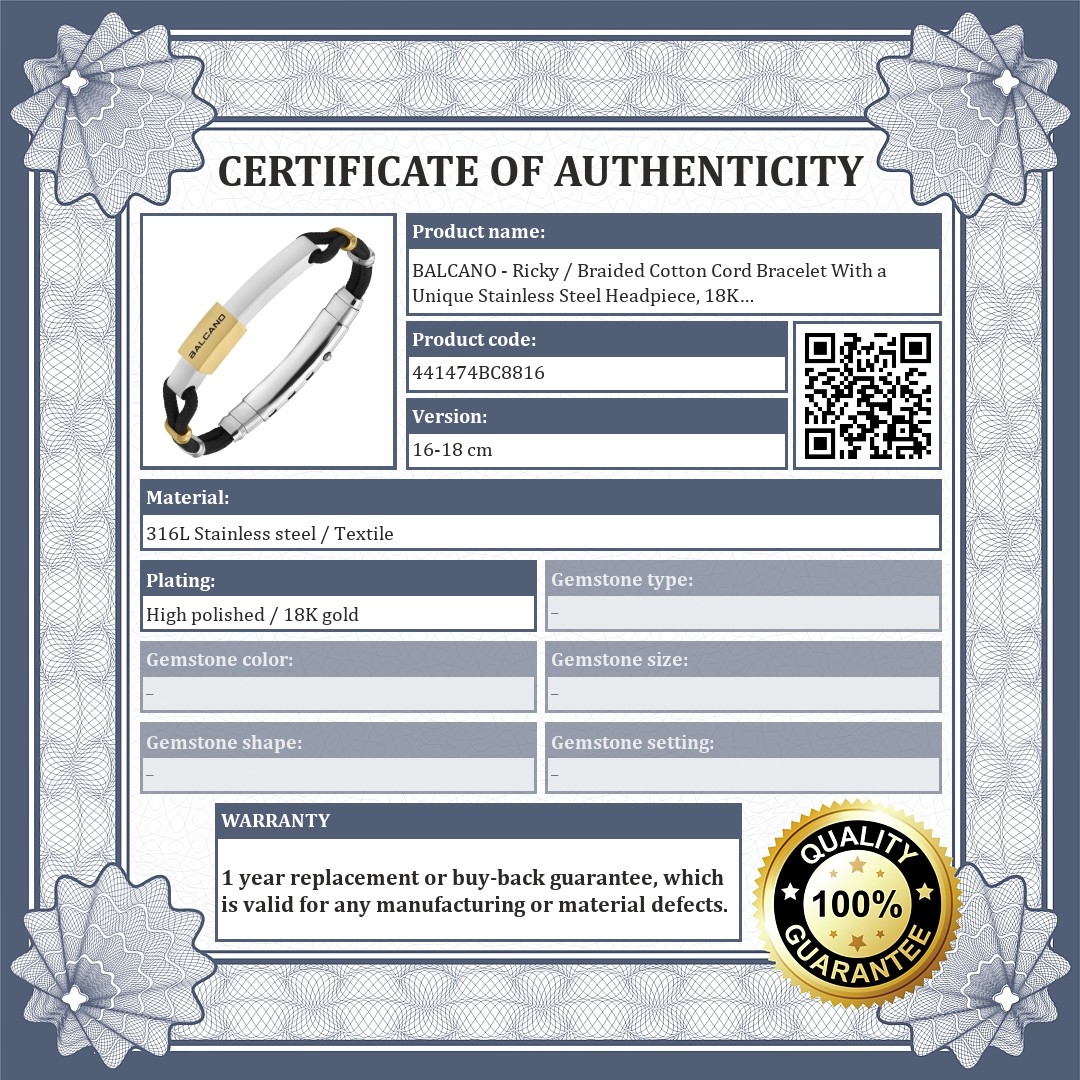 BALCANO - Ricky / Braided Cotton Cord Bracelet With a Unique Stainless Steel Headpiece, 18K Gold Plated