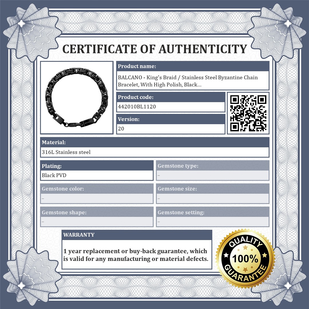 Premium quality king's braid chain bracelet for men, black PVD plated. 316L medical grade stainless steel jewelry, which does not wear or discolour due to its material. It is equipped with a strong lobster claw clasp decorated with the BALCANO inscription and logo.