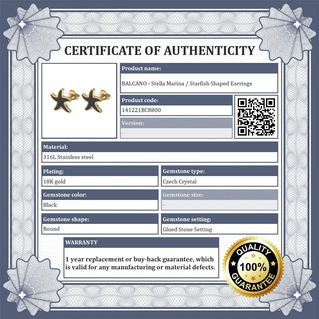 Fashionable starfish shaped stud earrings. 18K gold plated, anti-allergy, medical 316L stainless steel jewelry. Quality accessory set with sparkling black Czech crystals.