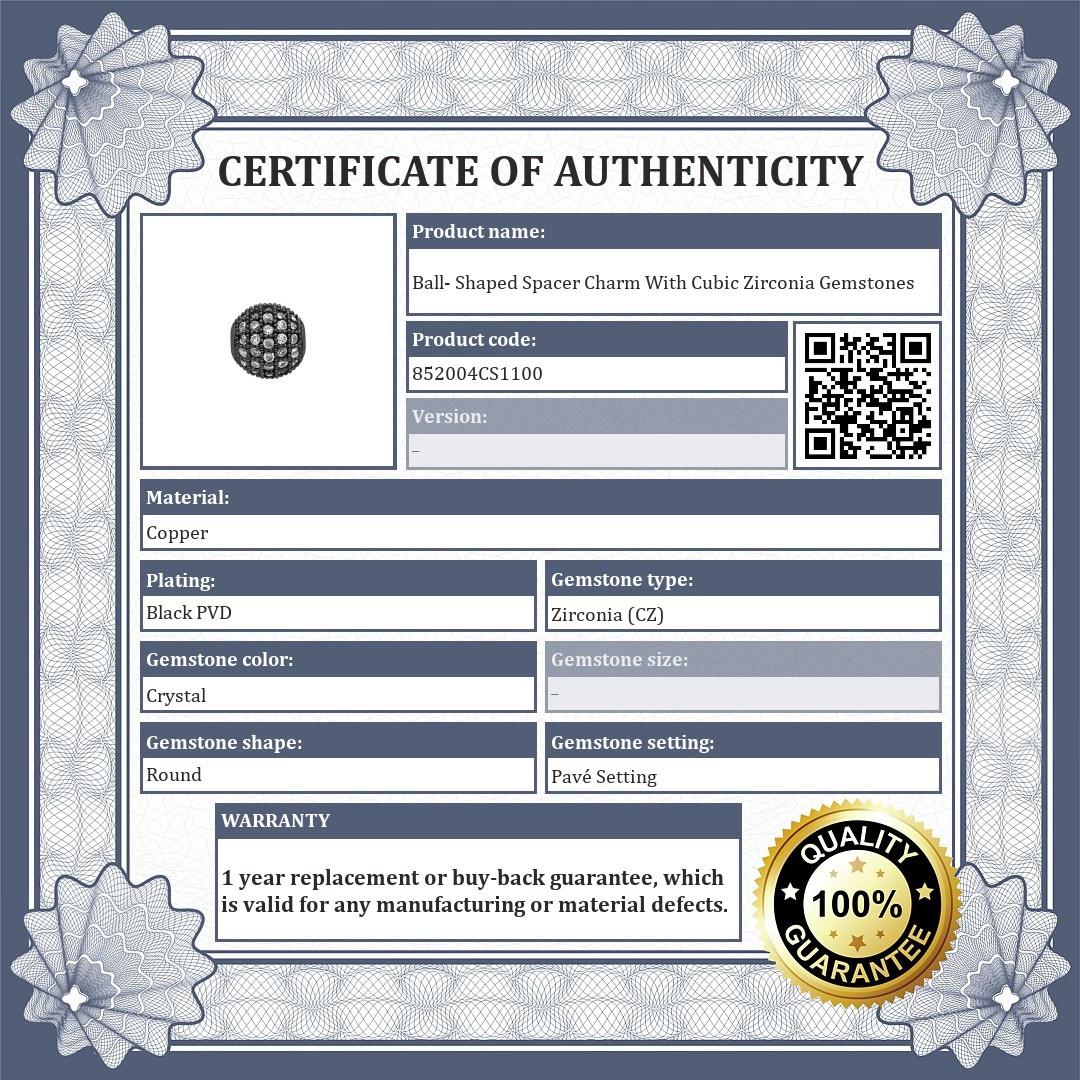 Ball- shaped spacer charm. It is decorated with sparkling cubic zirconia gemstones. Made of copper with black chrome PVD plated. The spacers ensure that your charms and beads don't slip off the bracelet.