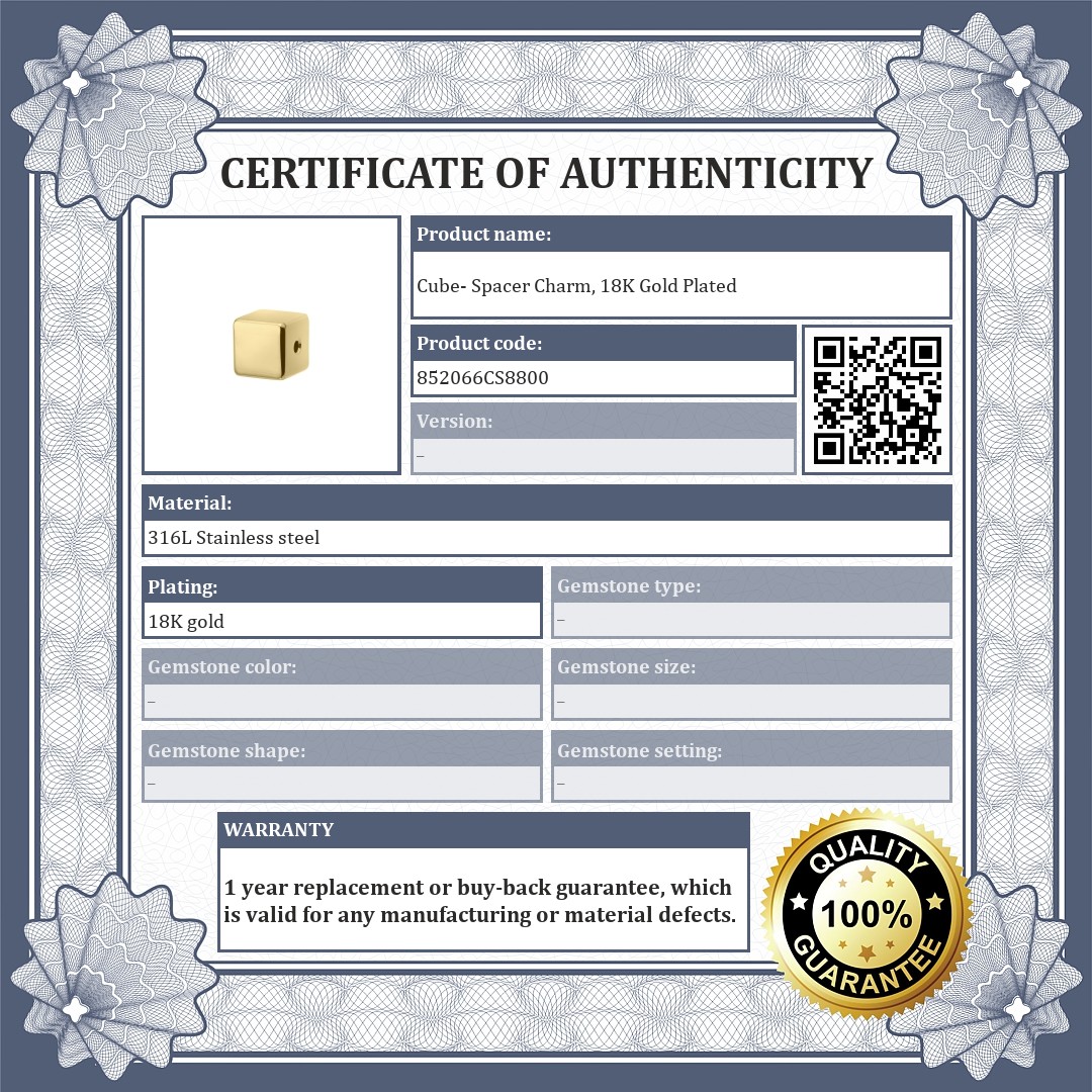 Cube- shaped spacer charm. Made of 316L medical grade stainless steel with 18K gold plated. The spacers ensure that the charms and beads do not slip off your bracelet.