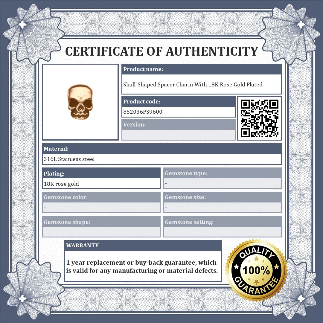 Skull shaped spacer charm. 316L medical grade stainless steel accessory, 18K rose gold plated. The spacers ensure that the charms and beads do not slip off your bracelet.