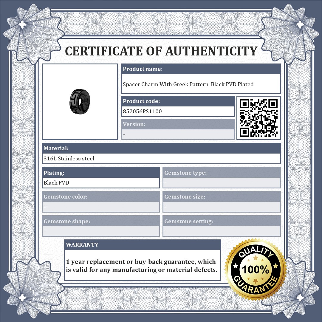 Round, engraved Greek pattern spacer charm. Made of 316L medical grade stainless steel with chrome, black PVD plated. The spacers ensure that the charms and beads do not slip off your bracelet. Choose the BALCANO charms that suit your taste and create your unique bracelet.
