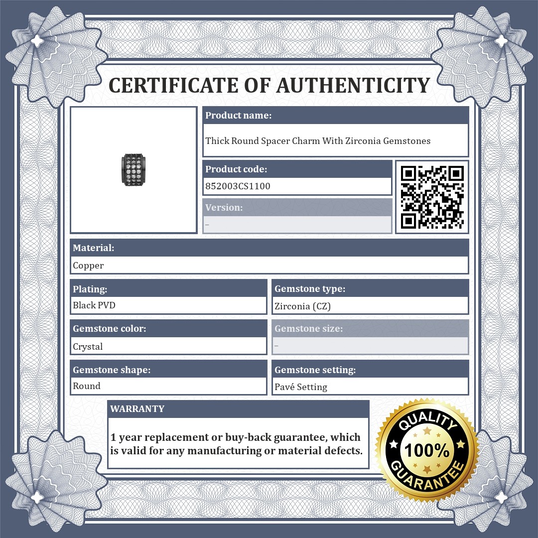Thick round spacer charm, decorated with rows of cubic zirconia crystals in a circle. Made of copper with black chrome PVD plated. The spacers ensure that your charms and beads will not slip on the bracelet.