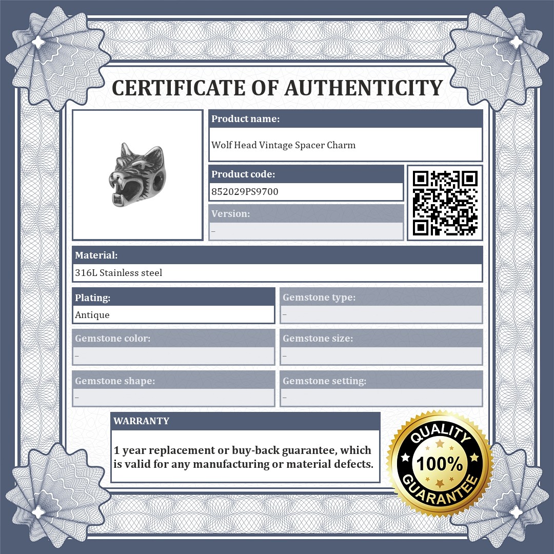 Wolf head shaped spacer charm. 316L medical stainless steel accessory with special antiqued plated. The spacers ensure that charms and beads do not slip off your bracelet.